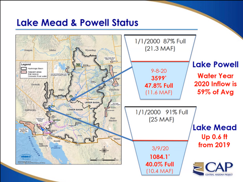 Colorado River System Reservoir Status-System Contents (amount of water in Lake Mead, Lake Powell and other smaller reservoirs) is at 49% as of 9/8/20. Go to USBR-Lower Colorado Region Website for the details. Lake Mead is at elevation 1,084.08 which is below elevation 1090' trigger for Tier Zero Restrictions of the Drought Contingency Plan (DCP) in 2020. This means Arizona must cut 192,000 acre-feet of its annual 2.8 million acre-feet allocation. USBR predicts that Lake Mead will be in Tier Zero through 2022 but could drop to Tier 1 if drought conditions worsen. If Tier 1 is reached, Arizona will need to cut 512,000 acre-feet. See Know Your H2O Part VII-Colorado River.