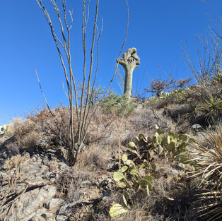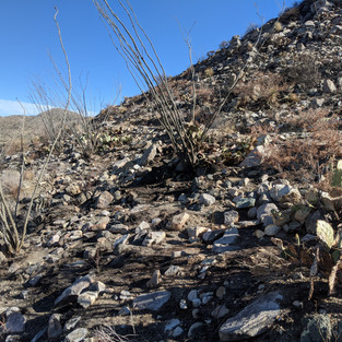 From our hike today down Wild Burro to Goat Pen, up Wild Burro Loop to Ridgeline. The burn area (see map left) starts on the far side of the Wild Burro wash as one approaches the wind mill, stays on that side as the trail passes the Goat Pen, and extends on both sides of the Wild Burro Loop trail all the way up to the Ridgeline Trail to the ridge overlooking Canyon Pass. The canyon that the Ridgeline trail overlooks is almost completely burned. The burn area ends a ways past the turn along the ridge over Canyon Pass. Fortunately the burn does not go into Canyon Pass, and the second canyon that the Ridgeline overlooks is not burned. The crested saguaro along the Ridgeline was not damaged!